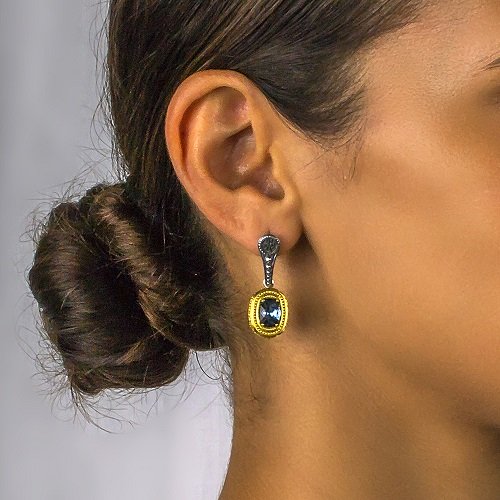 Two-sided sterling silver earrings with Swarovski crystals, semi precious gemstones and gold-plated ornate bezels.