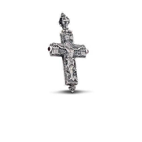 A unique and very detailed cross, inspired by Byzantine Orthodox design. Made of sterling silver and decorated with garnets gemstones at both ends.