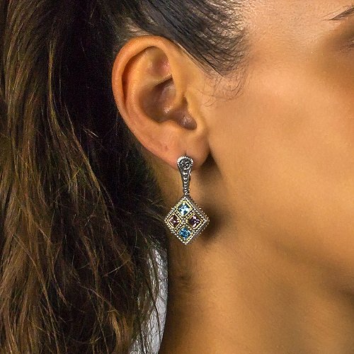 From the Hephaestus collection, an exceptional sterling silver pair of earrings with colorful Swarovski crystals in ornate gold-plated bezels.