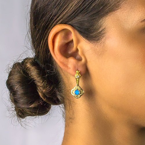Earrings with turquoise stone and zircon around the gold plated ornate bezel.