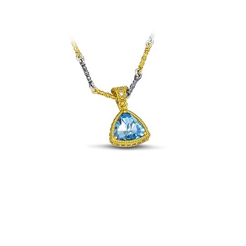 From the Passatempo collection, a distictive pendant with blue triangular Swarovski crystal with an ornate gold-plated wreath.