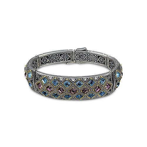 From the Hephaestus collection, a fine sterling silver degrade bangle bracelet with square multicolor Swarovski crystals set in gold plated silver ornate bezels.