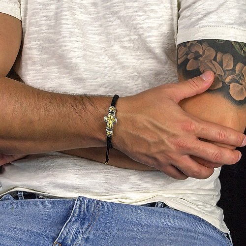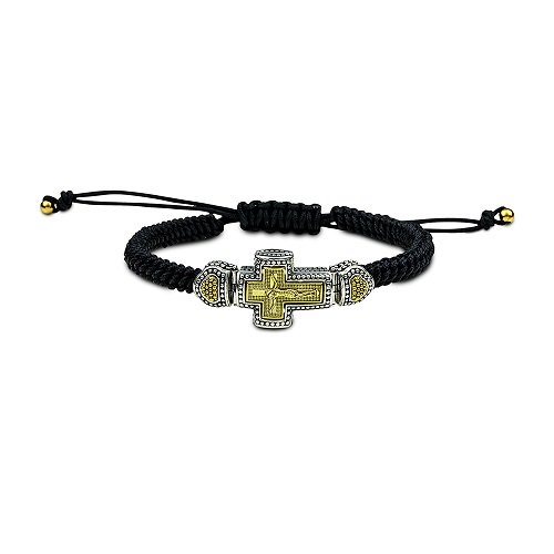 Bracelet macrame in the shape of a cross is in the collection of Anax. It consists of a handmade black macrame cord and a gold plated cross in the center.
