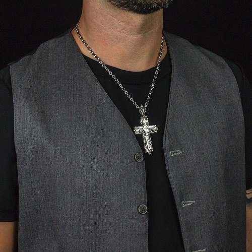 A unique and very detailed cross, inspired by Byzantine Orthodox design. Made of sterling silver and decorated with garnets gemstones at both ends.