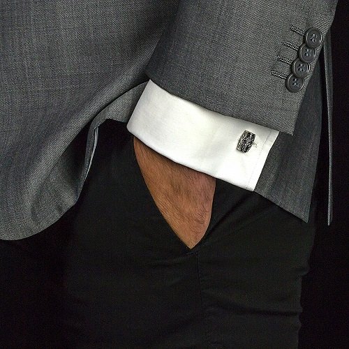 A discreet pair of sterling silver cufflinks decorated with engraved patterns.